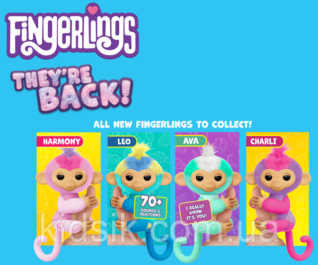 Абсолютно нові Fingerlings 2023 привносять душевний зв'язок до інтерактивної іграшкової гри. Ці чарівні маленькі мавпочки знають, коли вони у вас на пальці — їхні серця, що світяться, б'ються тільки для вас! Без вашого пальця, вони люблять мавпувати, а їхні нові рухливі хвости дозволяють їм сидіти, щоб грати та демонструвати більше можливостей.