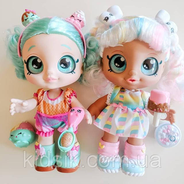 Це лялечки Kindi Kids від компанії Shopkins серії Rainbow Кінді. Кінді Кидс — це великі лялечки з блискучими очима і милою солодкої зовнішністю для дітей дошкільного віку. У серії Мосту Киди 4 лялечки: Маршу Мелоу, Донатина, Пеппа Мінт, Джессикейк. Кожна з них символізує якусь солодкість: маршмеллоу (зефирка), пончик, капкейк і морозиво. Ось звідки така солодка зовнішність і імена.