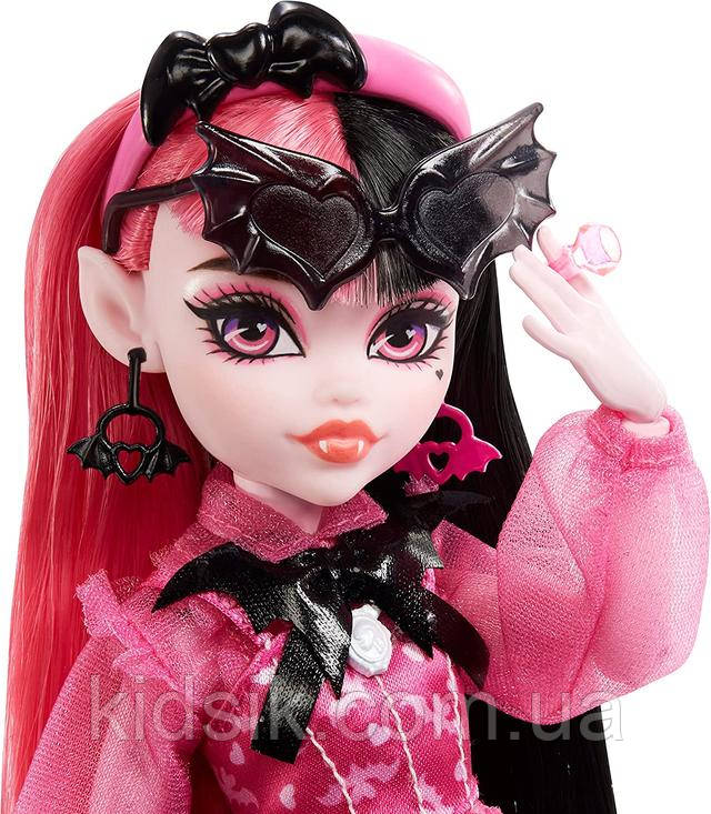 Дракулаура ходить коридорами Школи монстрів в модному вбранні, в шортах з сердечками і вампірській корсетній блузці з прозорими рукавами. Її химерно-казковий образ, натхненний вампірами, доповнений прозорими панчохами з оборками, рожевими туфлями на платформі, пов'язкою на голові та сонцезахисними окулярами з елементами кажана. Плюс лякаюче-шикарна накидка та аксесуари. Вихованець - моторошно-мила домашня кажан, Count Fabulous!