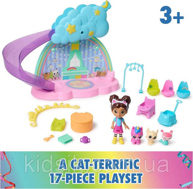 1 ігрова кімната, 1 фігурка Габбі (7,5 см), 3 кошеняти (кожен близько 4 см), гірка з подушкою, 3 колиски, арка, високий стільчик, гірлянда, поїльник, візочок, брязкальце, книжка, коробочка «доставка будиночка».